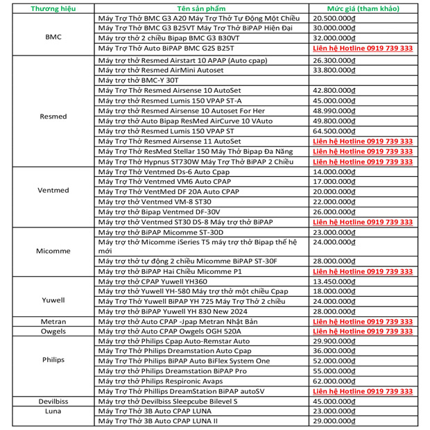 Thông qua bảng giá máy trở thở mới nhất 2025 được cập nhật dưới đây, bạn sẽ phần nào nắm được chi tiết giá cả và chức năng của từng máy trợ thở. Nhờ vậy, quá trình tìm mua máy trợ thở của bạn sẽ dễ dàng, tiết kiệm thời gian hơn.