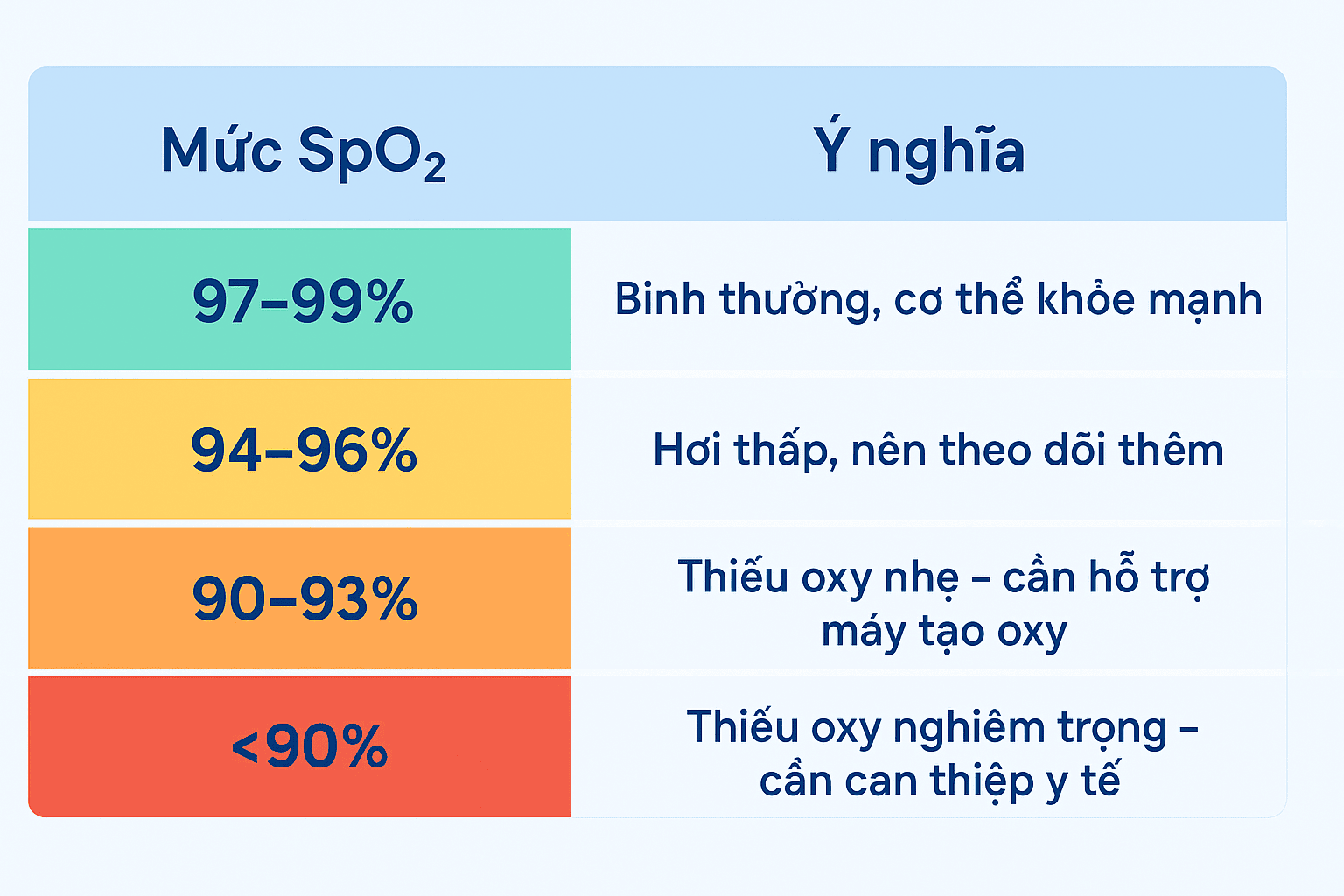 Nếu SpO₂ dưới 94%, cần điều chỉnh lưu lượng oxy hoặc liên hệ bác sĩ.