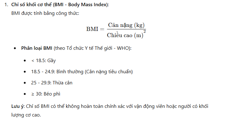 Cân nặng tiêu chuẩn ( BMI) là mức cân nặng được coi là phù hợp với chiều cao, độ tuổi, giới tính, và tình trạng sức khỏe tổng quát của một người. Đây là một chỉ số giúp đánh giá mức độ cân đối cơ thể và phòng ngừa các nguy cơ sức khỏe liên quan đến việc thiếu cân hoặc thừa cân.