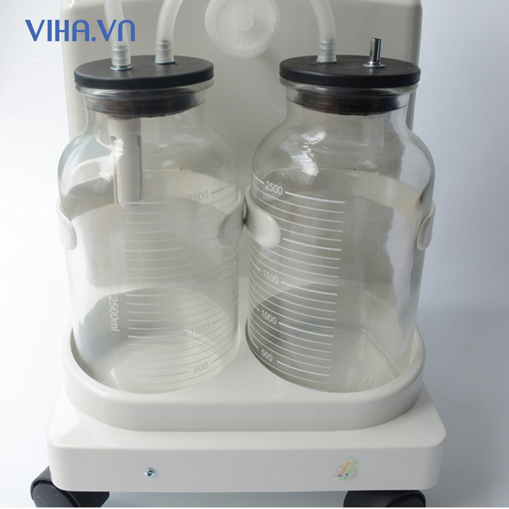 Máy hút dịch 2 bình Yuwell 7A-23D trang bị 2 bình chứa dịch có dung tích 2.5 lít/bình, cho thời gian sử dụng liên tục 30 phút, đáp ứng được tần suất sử dụng nhiều trong các bệnh viện, phòng khám. Máy hút dịch thiết kế có bánh xe giúp di chuyển dễ dàng.