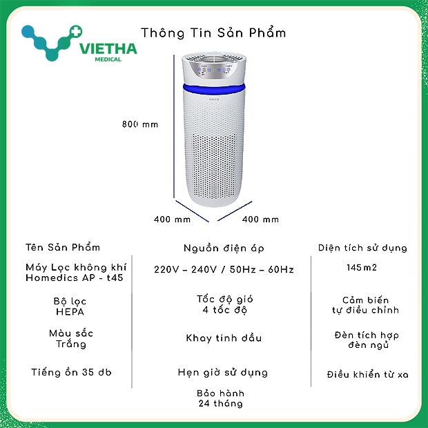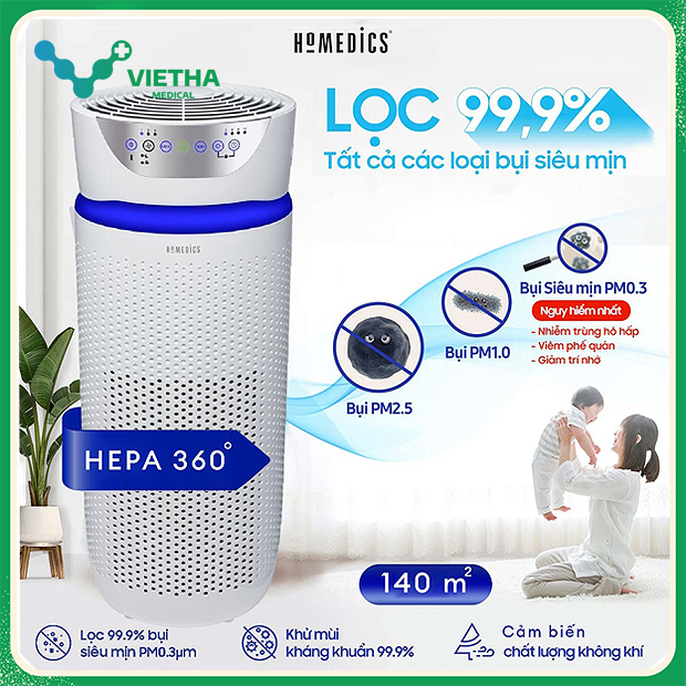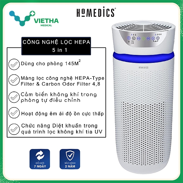 Máy lọc không khí HoMedics TotalClean® Deluxe UV 5‑in‑1 AP‑T45 – nhập khẩu nguyên chiếc từ Hoa Kỳ, được thiết kế chuyên biệt cho diện tích từ 50m² đến 145m², mang đến khả năng lọc bụi – diệt khuẩn – khử mùi – ion hóa – khuếch tán hương liệu vượt trội, giúp bảo vệ toàn diện sức khỏe cho gia đình và môi trường làm việc.