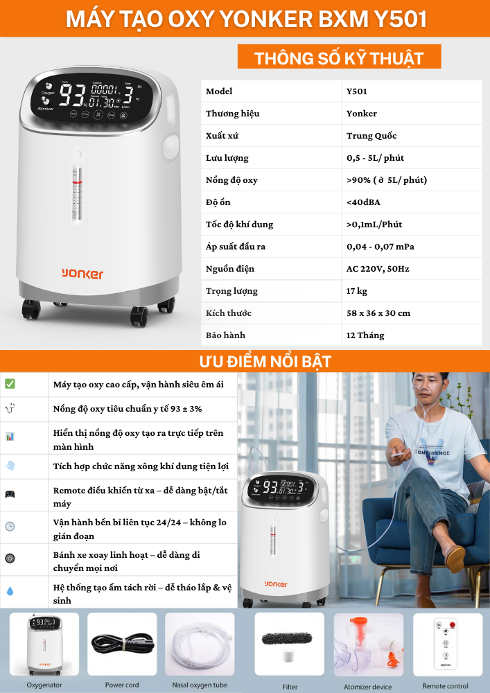 Yonker Y501W là mẫu máy tạo oxy y tế công suất 5 lít/phút, chuyên sử dụng để cung cấp oxy tinh khiết một cách liên tục cho các bệnh nhân có các vấn đề về hô hấp như viêm phổi, hen suyễn, K phổi, phổi tắc nghẽn,...