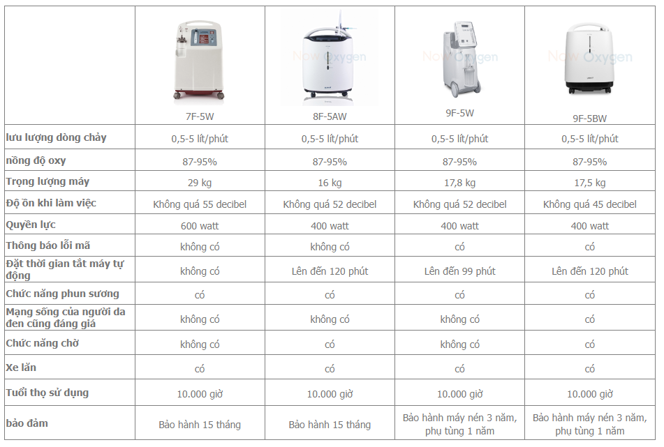 Bảng so sánh các dòng máy tạo oxy 5L của Yuwell