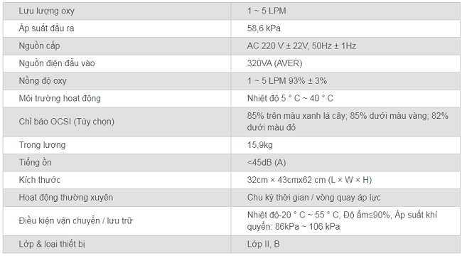 - Độ tinh khiết oxy AVG: 93% ± 3%.