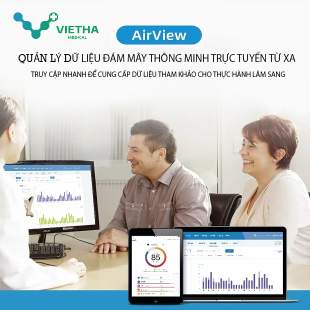 - Khả năng không dây cũng cho phép truy cập vào hệ thống quản lý bệnh nhân AirView dựa trên đám mây của ResMed, cung cấp hỗ trợ theo dõi, điều chỉnh và khắc phục sự cố từ xa bởi nhân viên có chuyên môn.