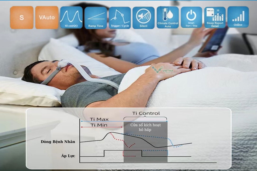 | Tính năng | - Climate Control: tạo ẩm không khí (tự động, tùy chỉnh 1 – 8 mức ẩm) - ClimateLineAir: làm ấm không khí (tự động, tùy chỉnh 16 – 30°C) - Easy-Breath: đồng bộ và mô phỏng nhịp thở tự nhiên - Trigger / Cycle / Ti Control: điều chỉnh độ nhạy hít vào / thở ra - Ramp: thời gian chờ tăng áp lực khí (tùy chỉnh 5 – 45 phút) - Smart Start: máy tự động chạy khi đeo mặt nạ - Smart Stop: máy tự động dừng khi tháo mặt nạ - Preheat: làm ẩm không khí trước khi dùng - Mask Fit: kiểm tra đeo mặt nạ kín khí hay chưa |