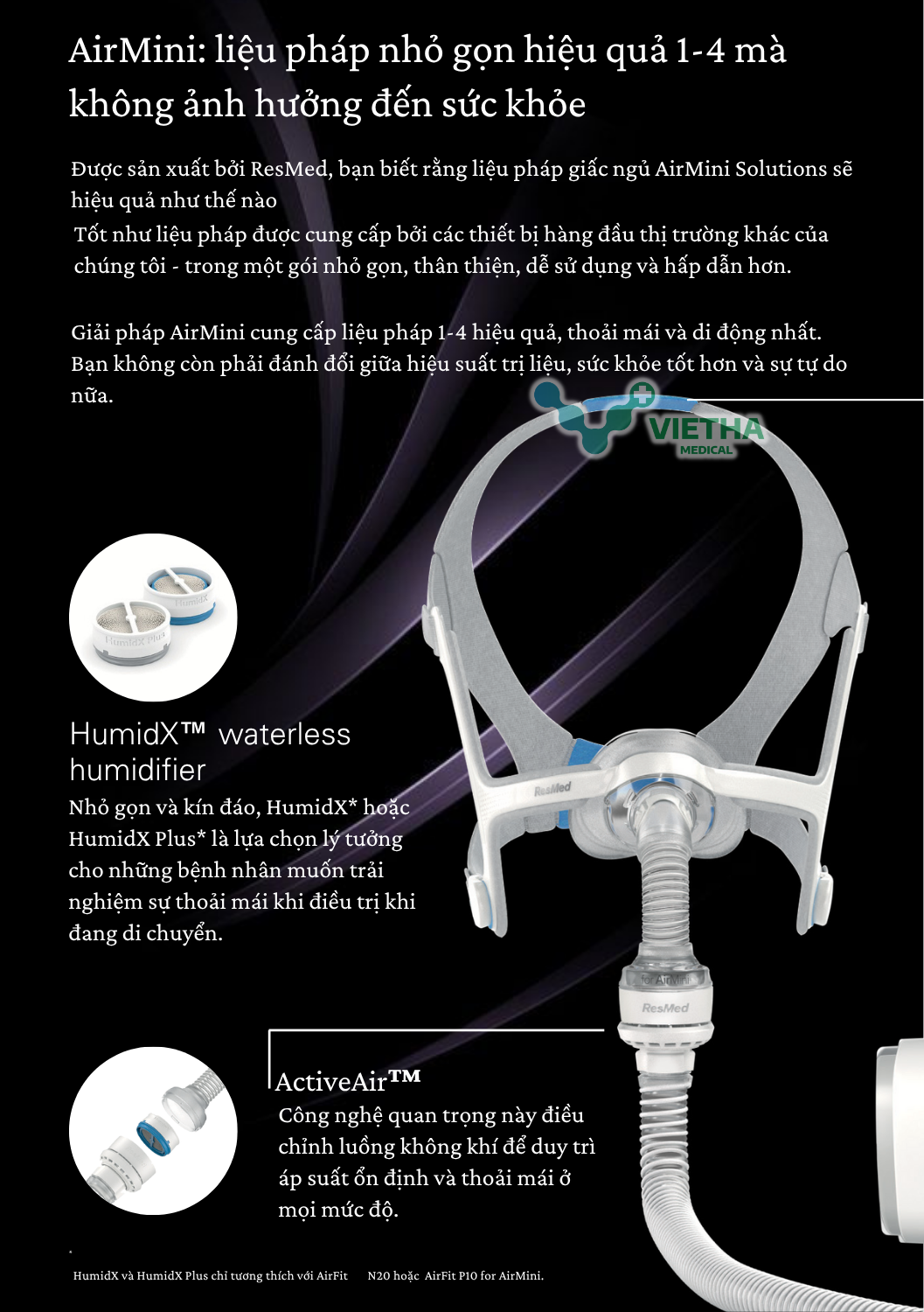 Máy trợ thở Resmed AirMini Autoset là máy trợ thở CPAP 1 chiều tự động dành cho bệnh nhân ngưng thở khi ngủ. Máy có kích thước nhỏ nhất trên thị trường. Với kích thước nhỏ và nằm gọn trong lòng bàn tay, nhưng máy vẫn trang bị đầy đủ chức năng và thuật toán mới nhất của hãng ResMed