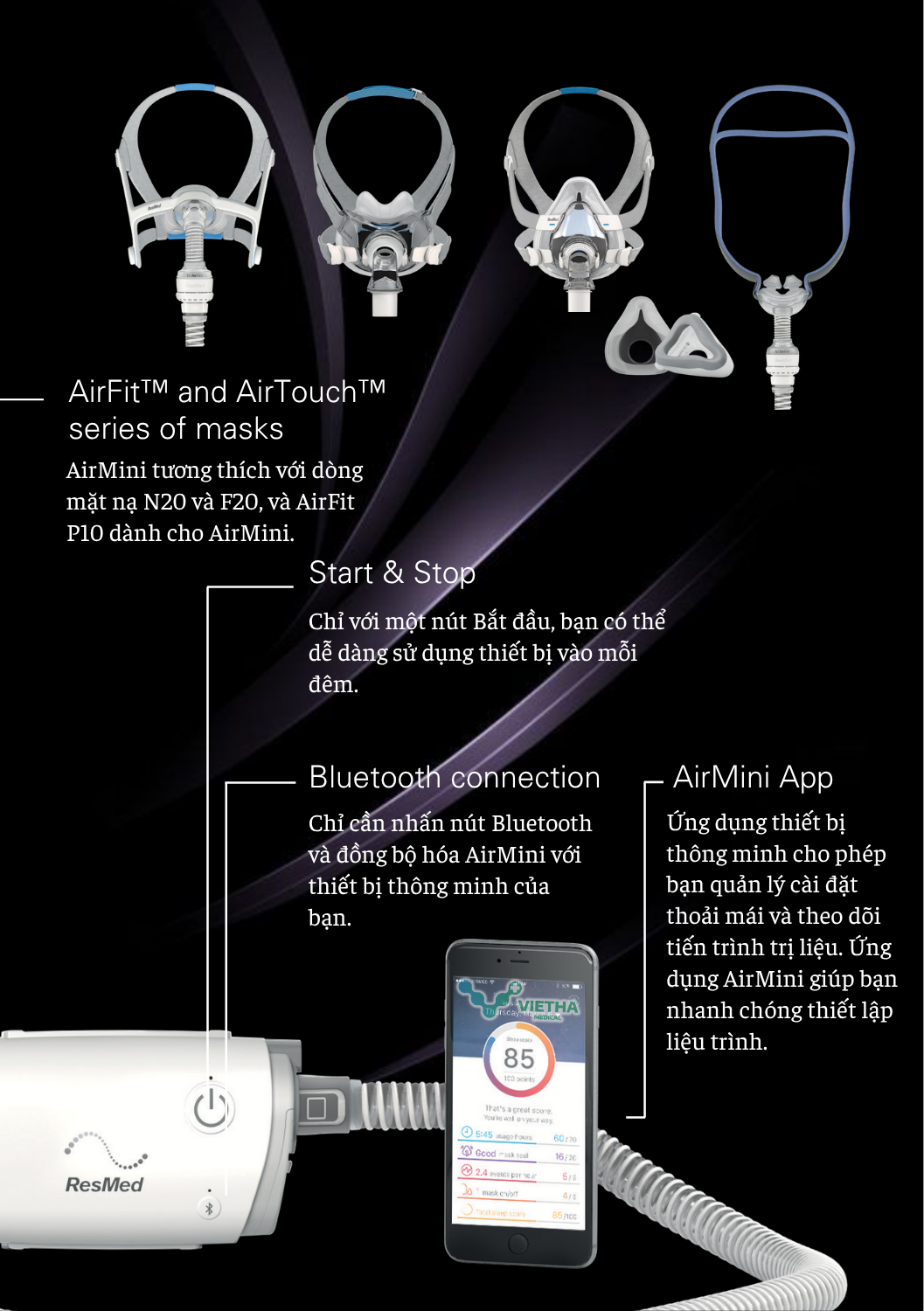 Máy AirMini Autoset được tích hợp kết nối Bluetooth, giúp máy kết nối với điện thoại qua ứng dụng AirMini App, cho phép xem kết quả sử dụng và cài đặt. Sau mỗi đêm sử dụng, máy sẽ báo cáo hiệu quả điều trị ngay trên điện thoại. Các chỉ số như: thời gian sử dụng máy, chỉ số ngưng giảm thở (AHI) còn lại, độ xì khí mặt nạ, áp lực khí trung bình trong đêm; chỉ số trung bình trong khoảng thời gian dài. Kết quả điều trị sẽ được lưu trong suốt cả năm. Qua đó giúp đánh giá hiệu quả điều trị