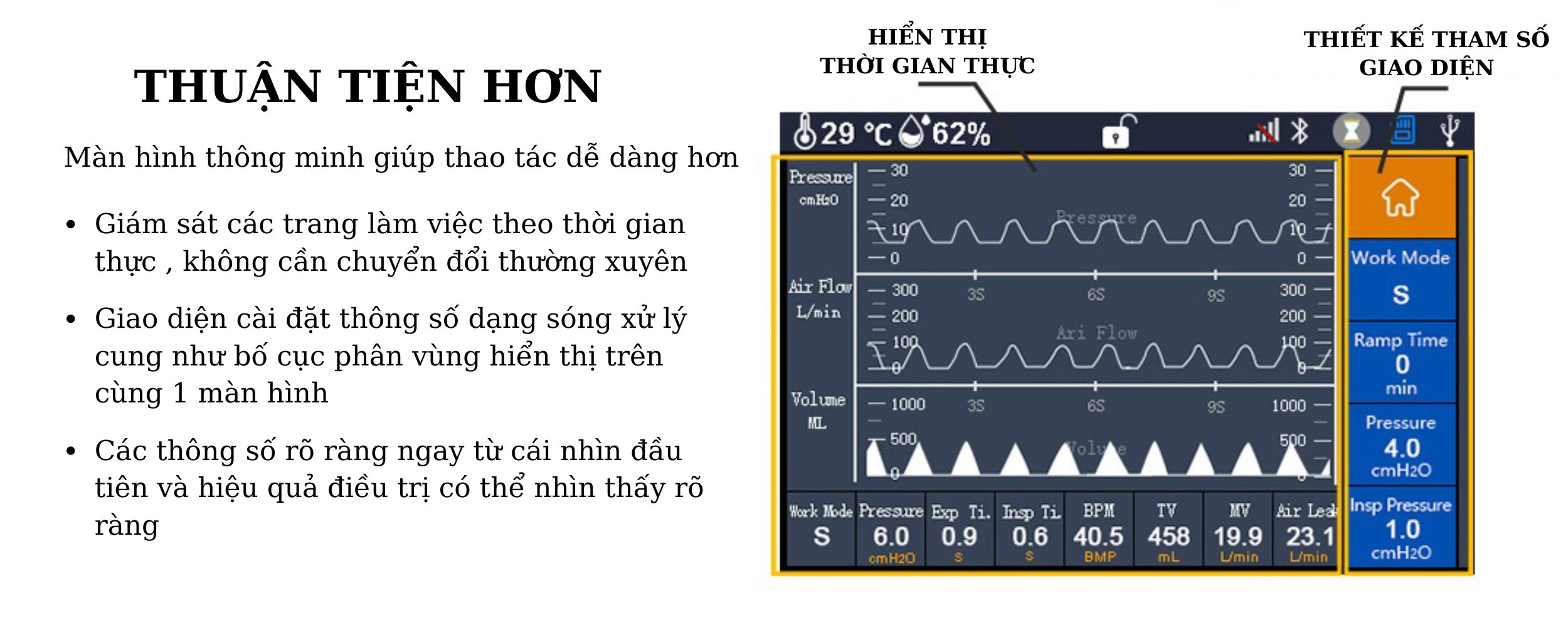 - Tính năng chờ (Ramp) cho phép người dùng điều chỉnh thời gian chờ để người dùng có thời gian đáp ứng với máy tốt hơn. Lúc đó áp lực khí mới được tăng dần cho đến mức áp lực điều trị.