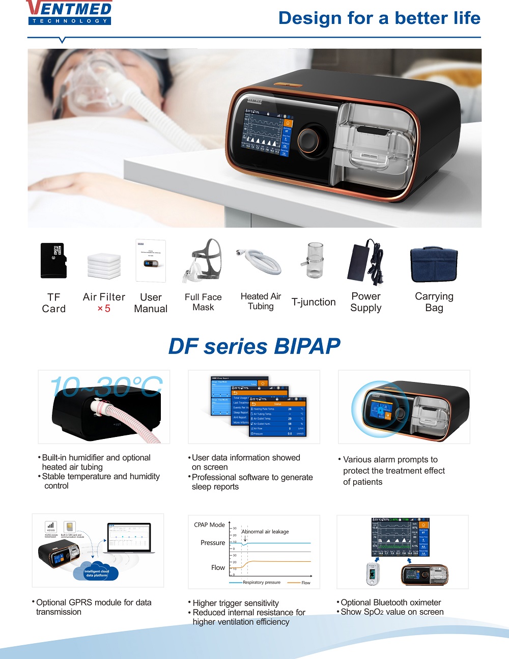 - Không phải tự nhiên mà các thiết bị hỗ trợ thở BIPAP của Ventmed ngày càng được ưa chuộng không chỉ tại nhà mà còn tại các cơ sở y khoa trên cả nước. Với các chế độ thuật toán được hãng Venmed đúc kết từ kinh nhiệm nghiên cứu, phát triển máy thở của mình, DF30V hoàn toàn đáp ứng được hầu hết tất cả các yêu cầu của bệnh nhân từ những bệnh lý mãn tính như COPD hay viêm phổi kèm theo cả hội chứng ngưng thở khi ngủ OSA.