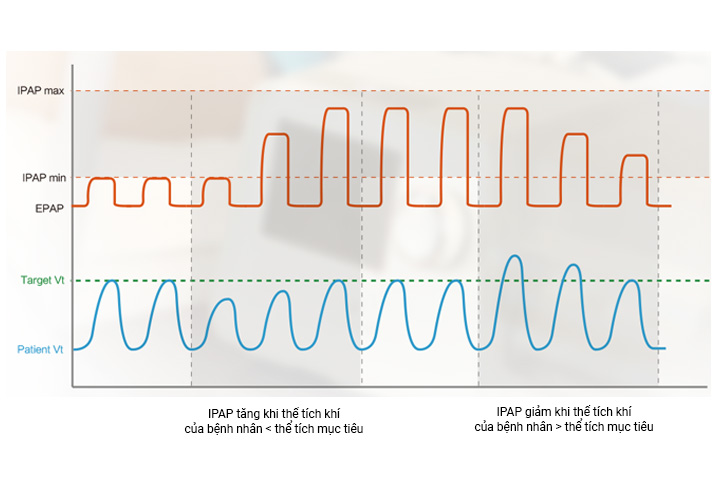 Target Tidal Volume: tự động điều chỉnh áp lực khí hít vào (IPAP) để đảm bảo đủ thể tích khí mục tiêu (Target Vt).