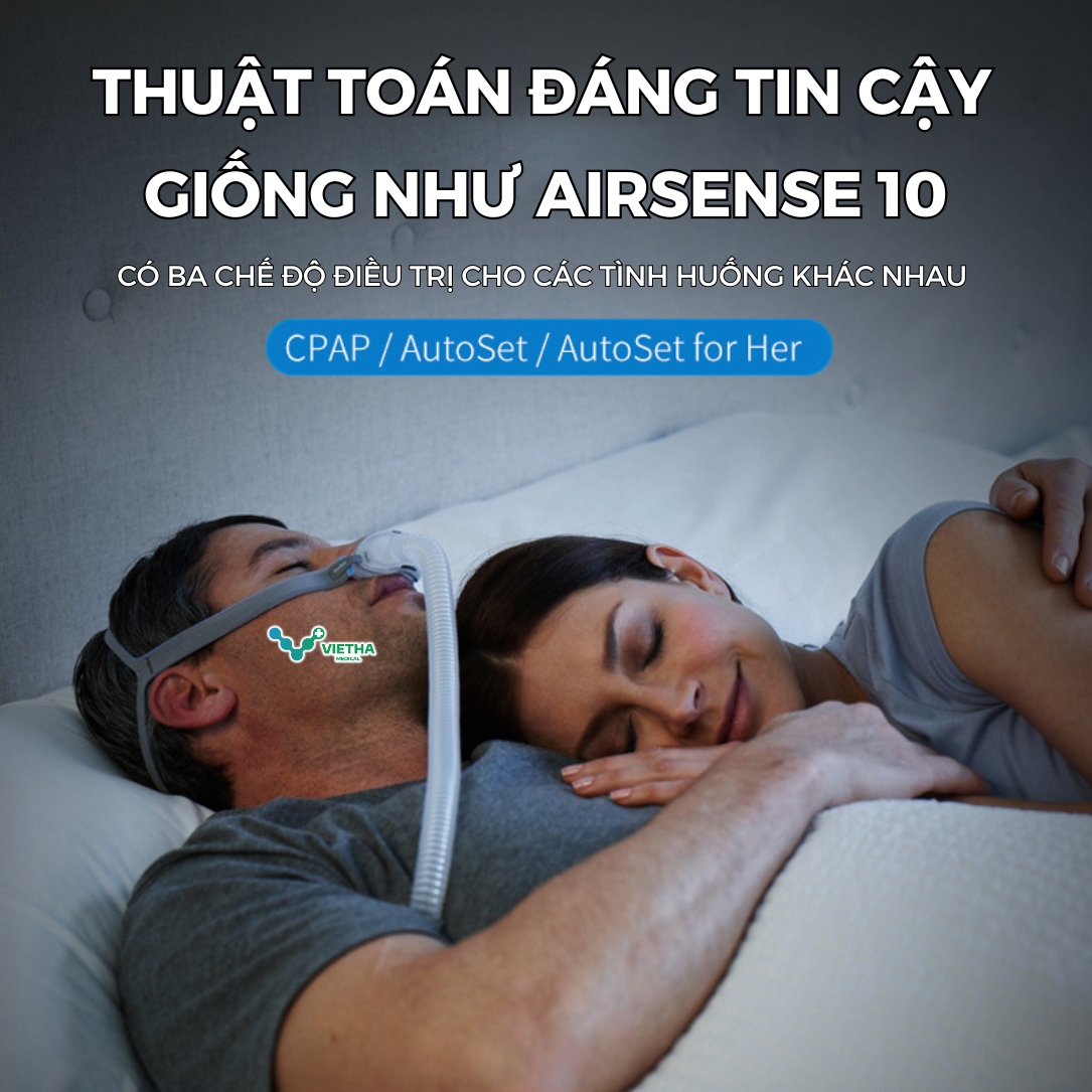 - Thuật toán Autoset for her được tối ưu cho phụ nữ. Phụ nữ thường ít ngưng thở, nhiều giảm thở, khó vào giấc ngủ lại dễ thức giấc. Nên thuật toán tăng độ nhạy đáp ứng với giảm thở, thay đổi áp lực khí nhẹ nhàng, tránh làm ảnh hưởng đến giấc ngủ.