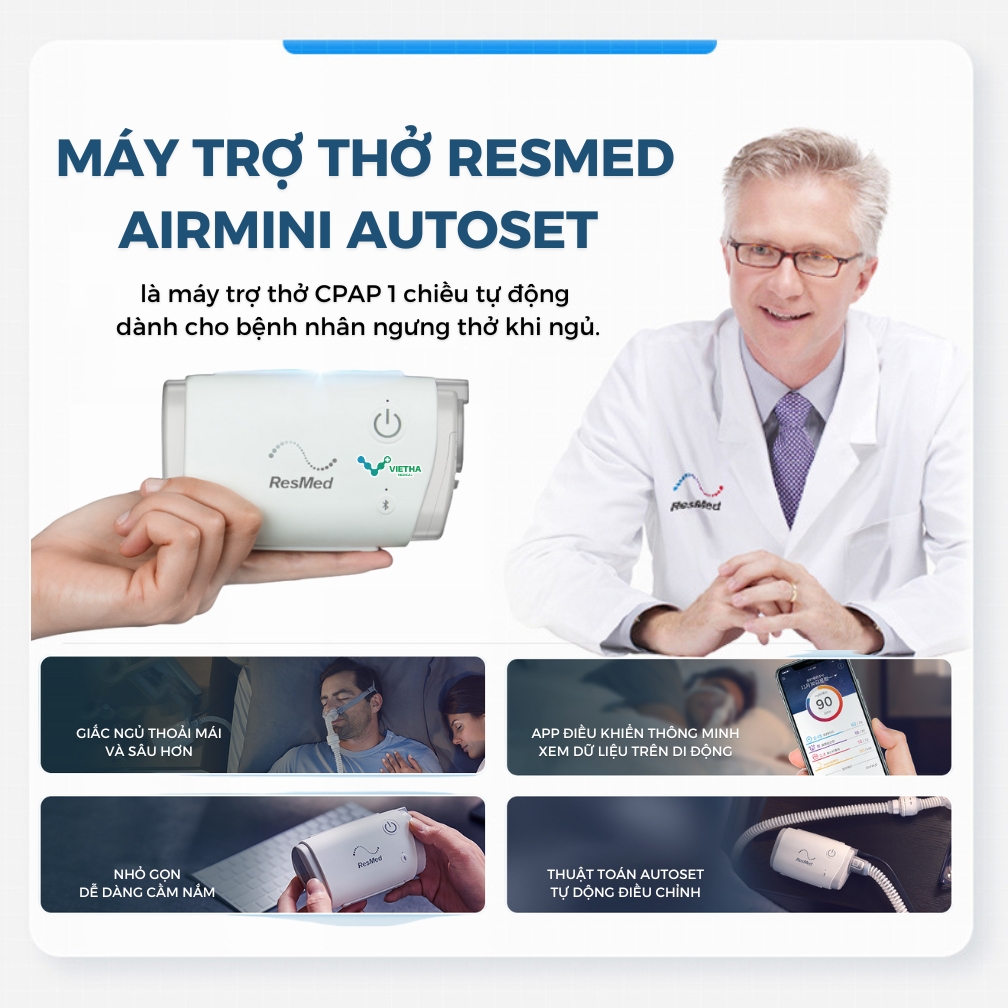 Máy trợ thở Resmed AirMini Autoset là máy trợ thở CPAP 1 chiều tự động dành cho bệnh nhân ngưng thở khi ngủ. Máy có kích thước nhỏ nhất trên thị trường. Với kích thước nhỏ và nằm gọn trong lòng bàn tay, nhưng máy vẫn trang bị đầy đủ chức năng và thuật toán mới nhất của hãng ResMed