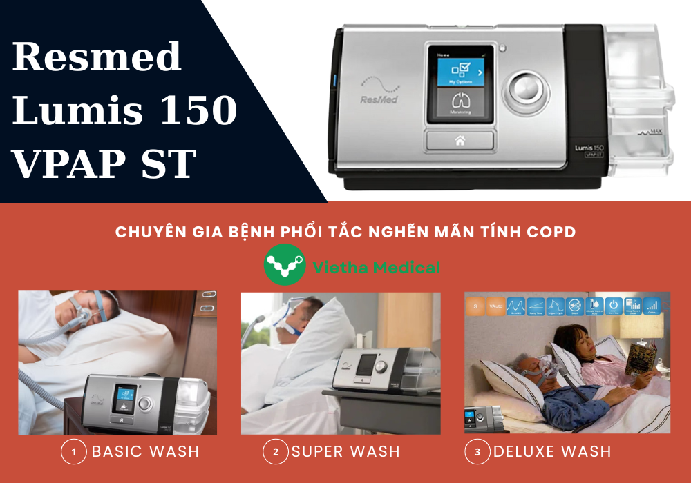 Resmed lumis 150 là dòng máy thở 2 chiều cao cấp của hãng Resmed. Đây là dòng máy cao cấp tích hợp nhiều tính năng hiện đại phù hợp cho nhiều bệnh nhân với mode thở VPAP hiện đại
