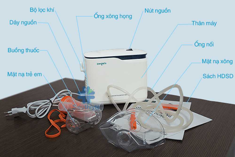 # Phụ kiện bao gồm: máy xông WH-702, buồng thuốc, mặt nạ xông thuốc (người lớn, trẻ em), sách HDSD.