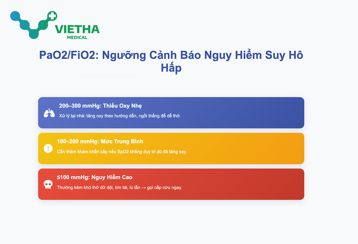 - ≤ 100: suy hô hấp nặng, nguy cơ ARDS.
