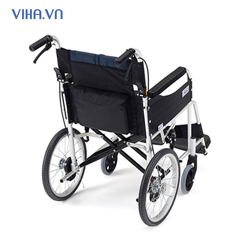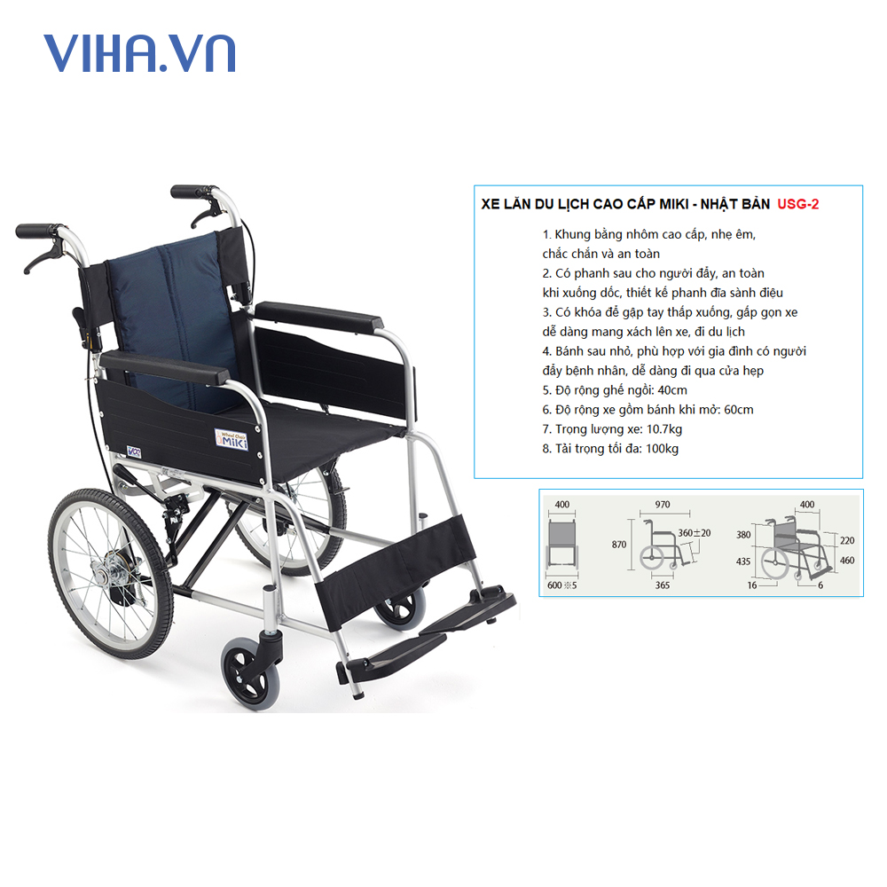Xe lăn Miki USG-2 không thiết kế bánh lăn, phù hợp với người dùng không tự lăn được, người đi du lịch, xe gọn nhẹ hơn những xe có bánh lăn.