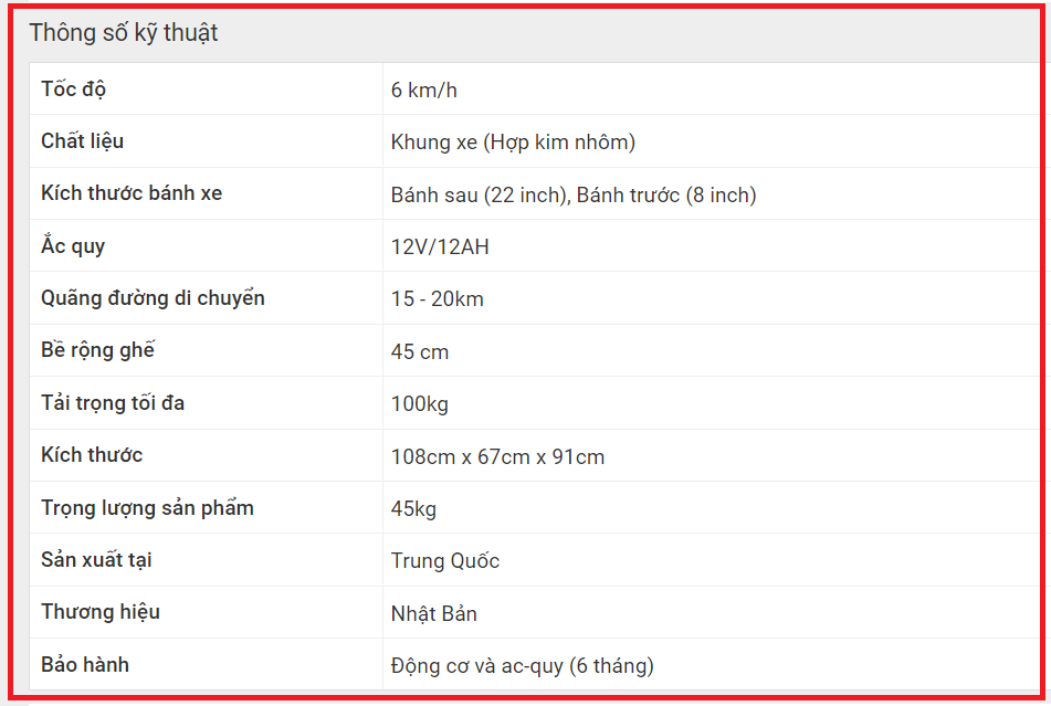 2. Thông số kỹ thuật của xe lăn điện Akiko A95-05