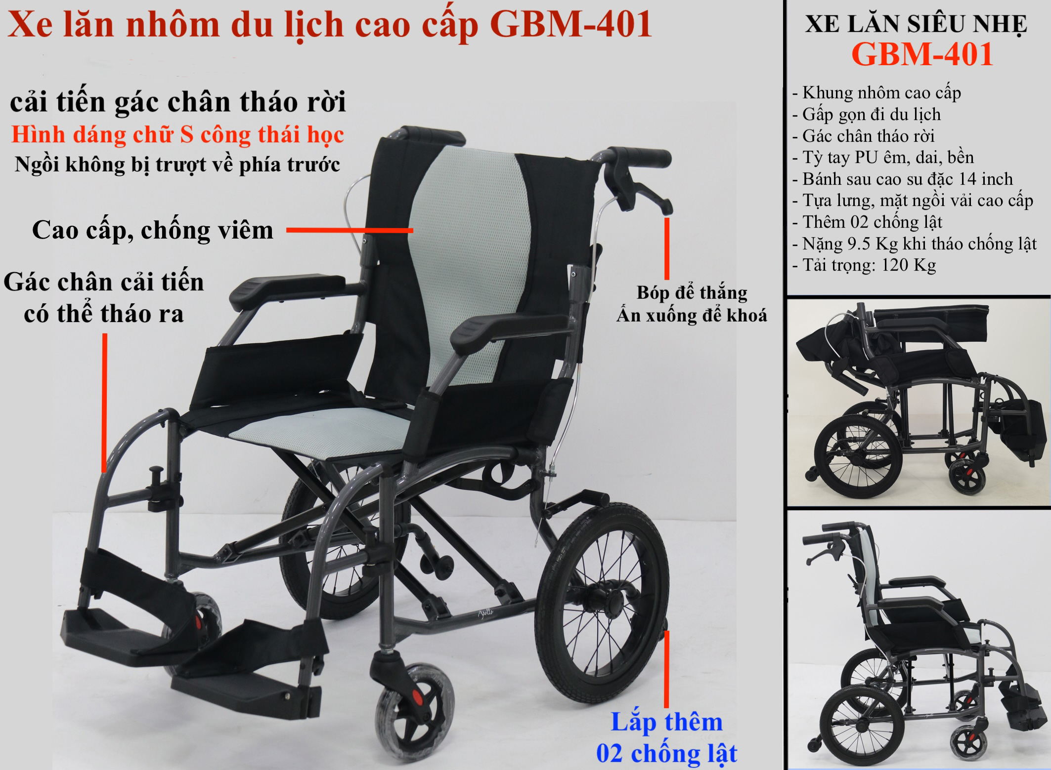 Xe lăn nhôm siêu nhẹ GBM-401 thuộc thương hiệu Gia Bảo Minh, là phiên bản cải tiến dành riêng cho thị trường Châu Âu với nhiều tính năng nổi bật: gác chân tháo rời, chống lật an toàn, khung nhôm chữ S siêu nhẹ. Đây là dòng xe lăn cao cấp, phù hợp cho người già, người bệnh, người khuyết tật cần hỗ trợ di chuyển an toàn, thoải mái và tiện lợi.
