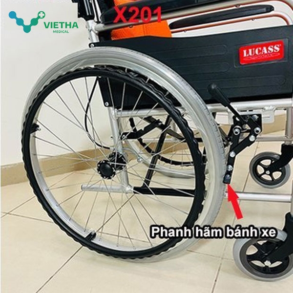 - Hai bên bánh xe có phanh hãm, giúp cố định xe, giữ an toàn cho người ngồi mỗi khi lên xuống xe hoặc khi đỗ xe không di chuyển