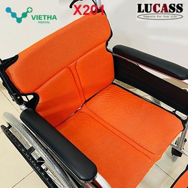 Xe lăn Lucass X201 có 2 phiên bản: Phiên bản thường ( màu đen ) và phiên bản nâng cấp ( màu cam ) . Phiên bản thường đệm ngồi và đệm tựa có 1 lớp màu đen. Phiên bản nâng cấp đệm ngồi và đệm tựa có 2 lớp, lớp dưới bằng vải màu đen, lớp trên tháo rời bằng vải lưới màu cam.