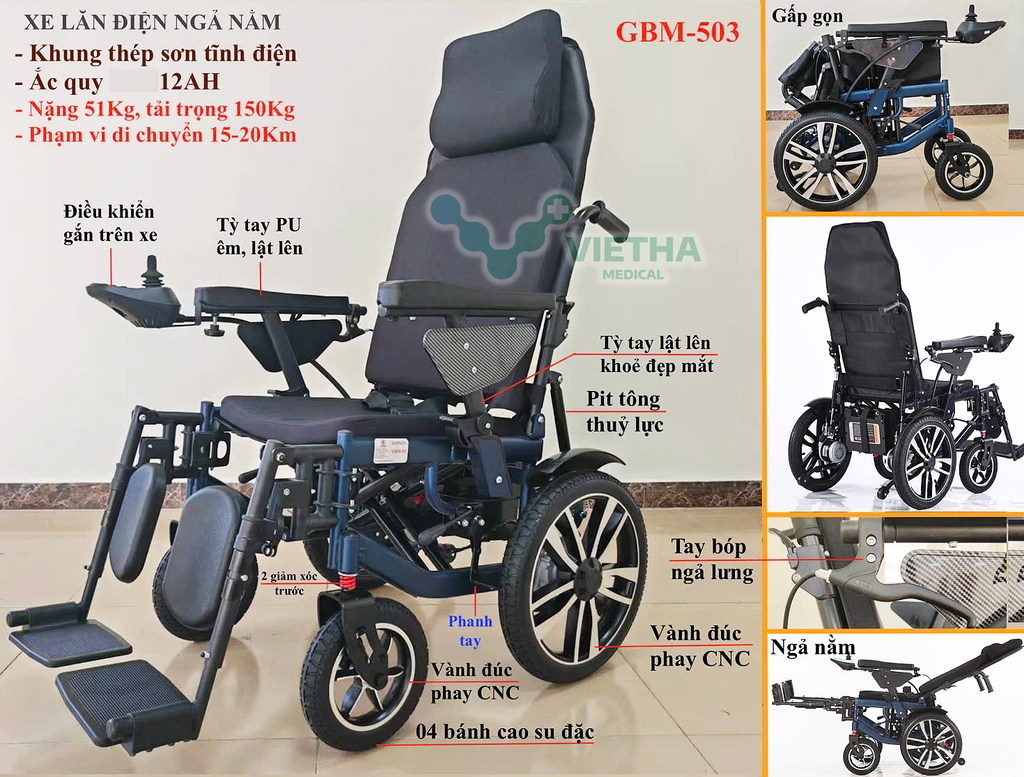 Xe lăn điện ngả nằm GBM-503 là mẫu xe lăn cao cấp xuất khẩu châu Âu, thuộc thương hiệu Gia Bảo Minh, được thiết kế hiện đại, chắc chắn và an toàn tuyệt đối. Đây là lựa chọn lý tưởng cho người cao tuổi, người khuyết tật, người bệnh cần hỗ trợ di chuyển, giúp họ tự tin, thoải mái hơn trong sinh hoạt hằng ngày.