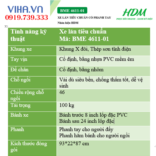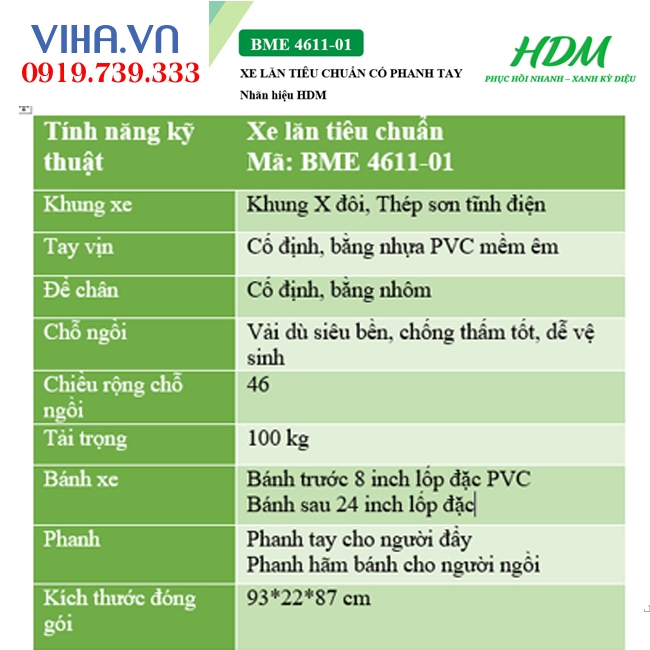 Thông số kỹ thuật của xe lăn tay Hedimed tiêu chuẩn có phanh